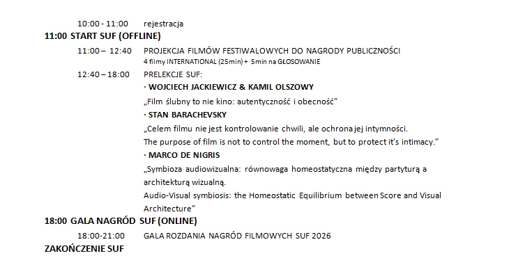 W zależności od ilości zgłoszonych filmów oraz uczestników imprezy będziemy na bieżąco wprowadzać poprawki, a oficjalna wersja harmonogramu zostanie opublikowana w dniu 05.04.2026r
